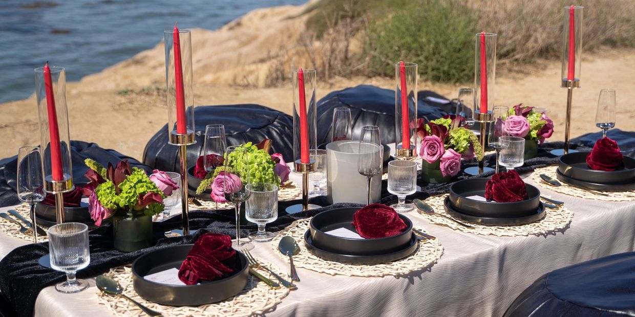 • Tabletop styling: linens, plates, glassware, candles, florals
